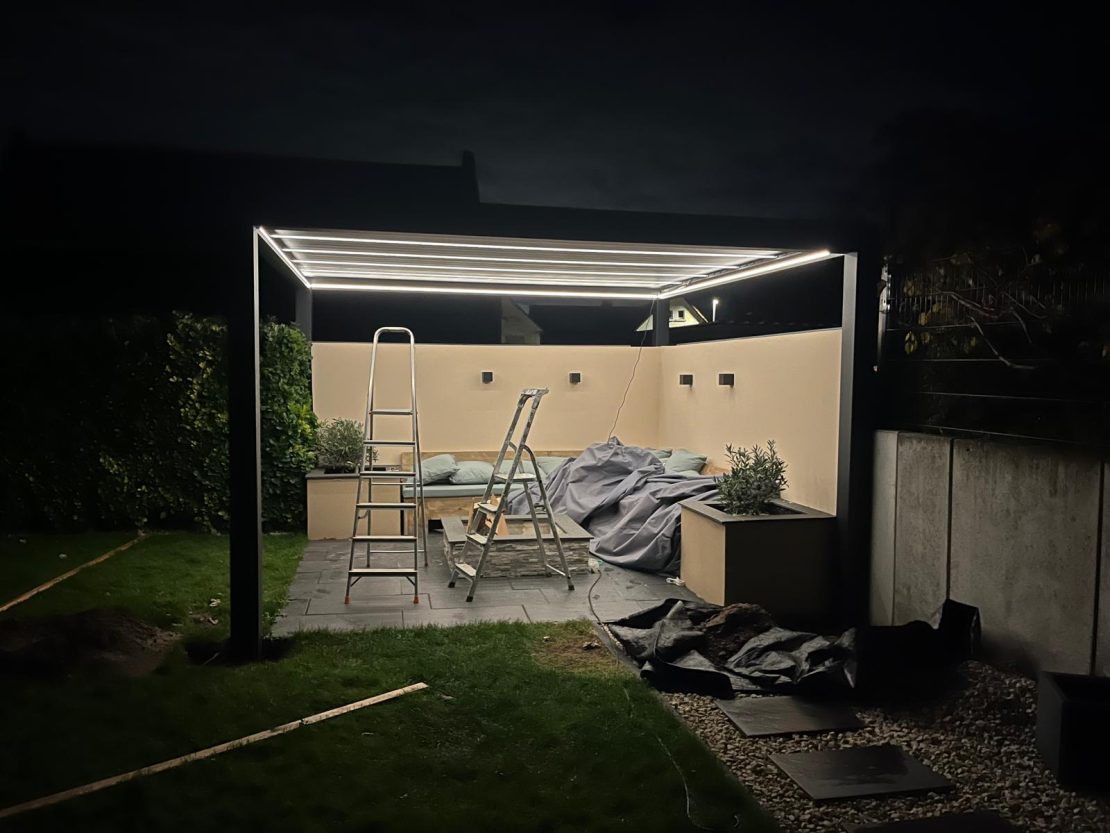 Die Bilder zeigen den Aufbau am Tag sowie die eindrucksvolle LED-Beleuchtung bei Nacht. Durch die stufenweise regulierbaren Lamellen bietet diese Pergola optimalen Sonnenschutz am Tag und schafft abends ein stimmungsvolles Ambiente.