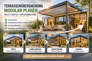 Wer heute eine Terrassenüberdachung oder ein Lamellendach plant, sollte weiter denken. Systeme wie AirCube wachsen mit – von der ersten Überdachung bis zum vollständigen Wohnraum.